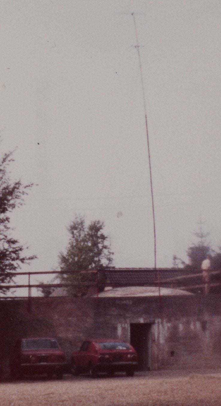 2 x 8 Meter stijgerpijp werden ONDER de rode Datsun van Henk gebonden, en met gevaar voor eigen leven naar België getransporteerd, de 3 elements richt antenne EN en kruisdipool er aan bevestigd samen met de nodige meters coax kabel, en het geheel vastgemaakt met beugels en tuidraden aan de bunker.